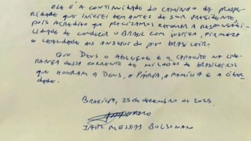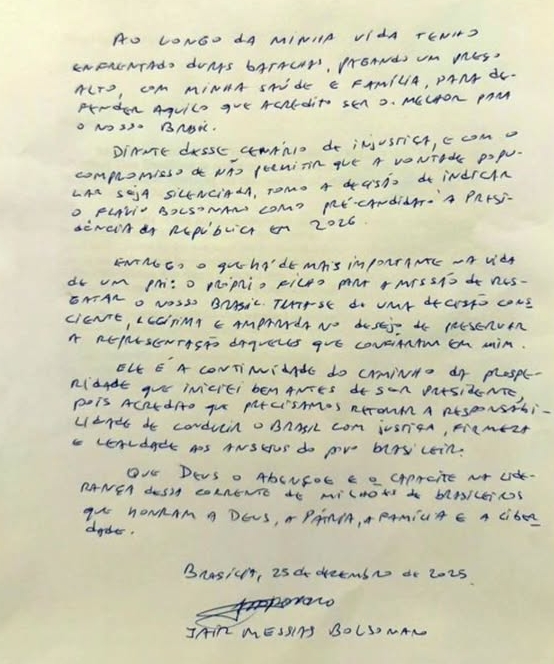 O ex-presidente Jair Bolsonaro anunciou, por meio de uma carta manuscrita datada de 25 de dezembro de 2025, a indicação do senador Flávio Bolsonaro (PL-RJ) como pré-candidato à Presidência da República nas eleições de 2026.